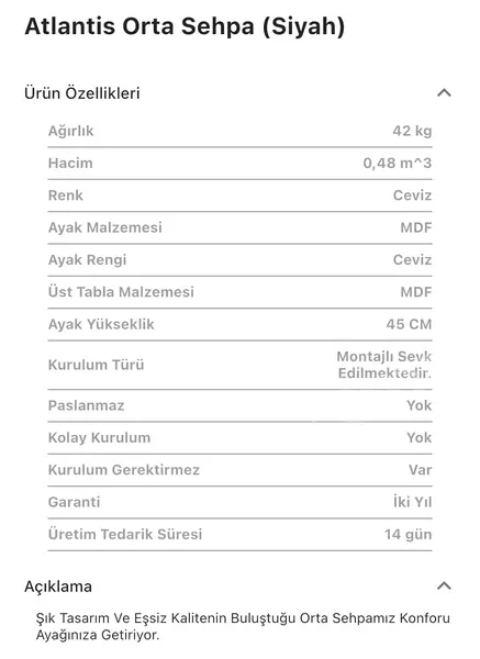 Takım içeriğinde 1 adet Atlantis Siyah Orta Sehpa bulunmaktadır.