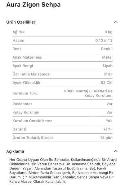 Takım içeriğinde 1 adet Aura Zigon Sehpa bulunmaktadır.