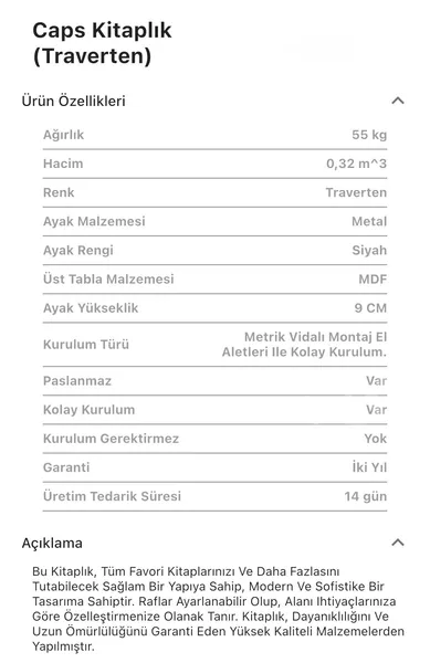 Takım içeriğinde 1 adet Caps Siyah, Traverten Kitaplık bulunmaktadır.