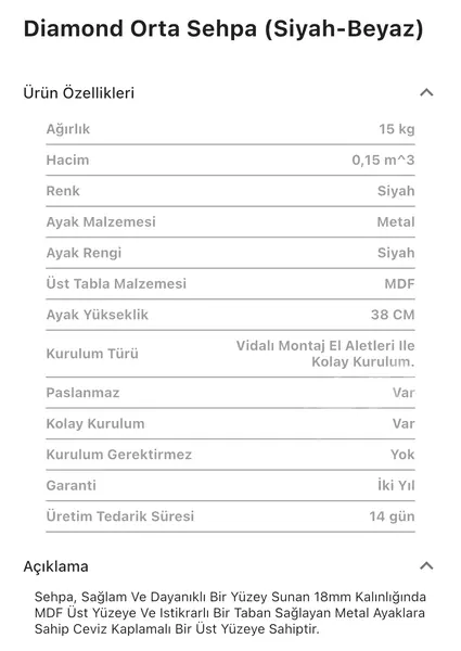Takım içeriğinde 1 adet Diamona Siyah, Siyah Orta Sehpa bulunmaktadır.