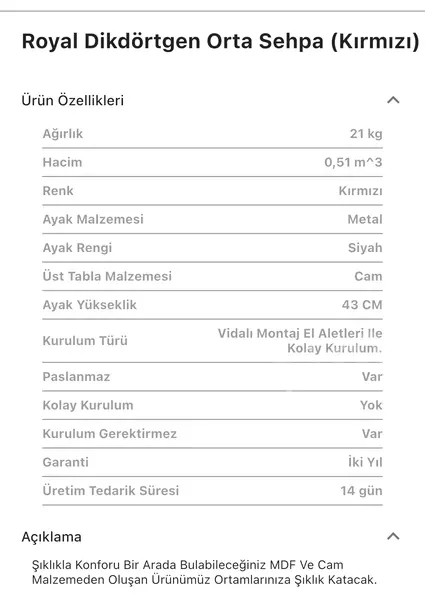 Takım içeriğinde 1 adet Royal Dikdörtgen Siyah, Kırmızı Orta Sehpa bulunmaktadır.