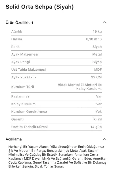 Takım içeriğinde 1 adet Solid Siyah Orta Sehpa bulunmaktadır.