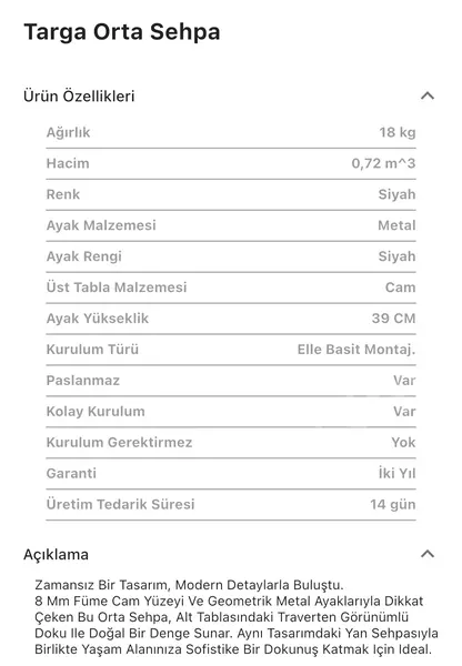Takım içeriğinde 1 adet Targa Orta Sehpa bulunmaktadır.