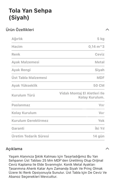 Takım içeriğinde 1 adet Tola Siyah Yan Sehpa bulunmaktadır.