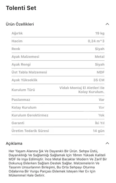 Takım içeriğinde 1 adet Tolenti Orta Sehpa bulunmaktadır.